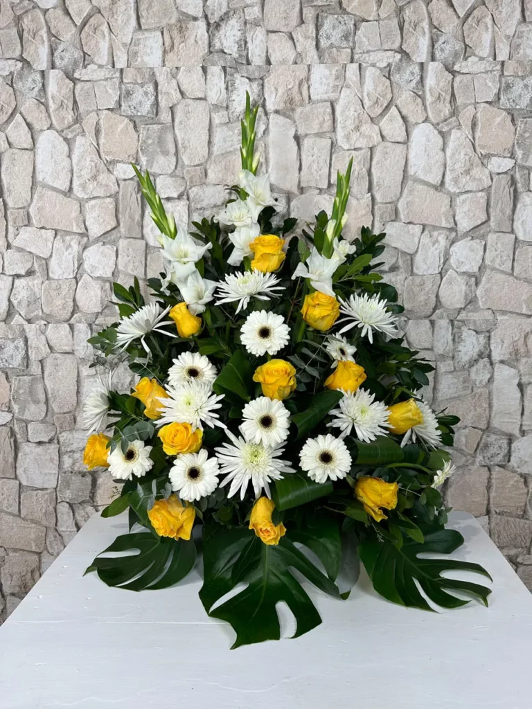 Nuestro Centro de flores Navafría es un centro de flores confeccionado con cariño y esmero. Con una combinación de tonos alegres combinando blancos y amarillos, una composición adecuada para despedir a nuestros seres queridos.