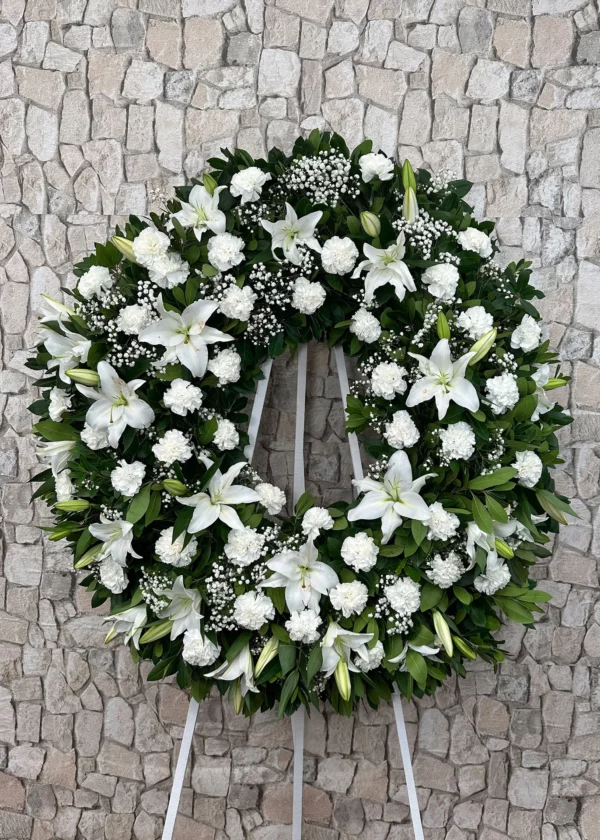 Los lilium orientales blancos representan belleza y pureza en su máximo esplendor, al mismo tiempo son una muestra total de honestidad, cariño y bondad hacia la persona que van dirigidas. Estas, nos llevan a ofrecer la esperanza de que el difunto descanse en paz, tranquilo y observándonos desde un lugar mejor. No termina una vida sino que inicia un viaje hacia un destino, el cual, antes o después, compartiremos de nuevo junto con esa persona tan especial y apreciada por nosotros. Sin lugar a dudas, la combinación de flores blancas con verdes variados de nuestra Corona de flores La Gavia, constituye un diseño básico y al mismo tiempo adecuado para acompañar en el duelo. Si tiene alguna duda sobre nuestra Corona fúnebre de flores La Gavia , póngase en contacto con nuestro equipo especializado y deje asesorarse en un día tan difícil donde resulta muy complicado dar el último adiós.Productos relacionados