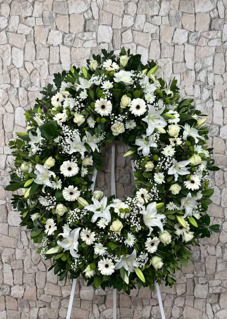 La Corona de flores Monte es una corona de flores con la que ofrecer nuestras condolencias hacia un ser querido se hace bastante más fácil. Con nuestra corona de flores mostraremos cariño y afecto hacia sus seres queridos, en un día en el que prima la cercanía y el cariño de nuestros familiares y amigos.Tamaño de la corona funeraria de flores