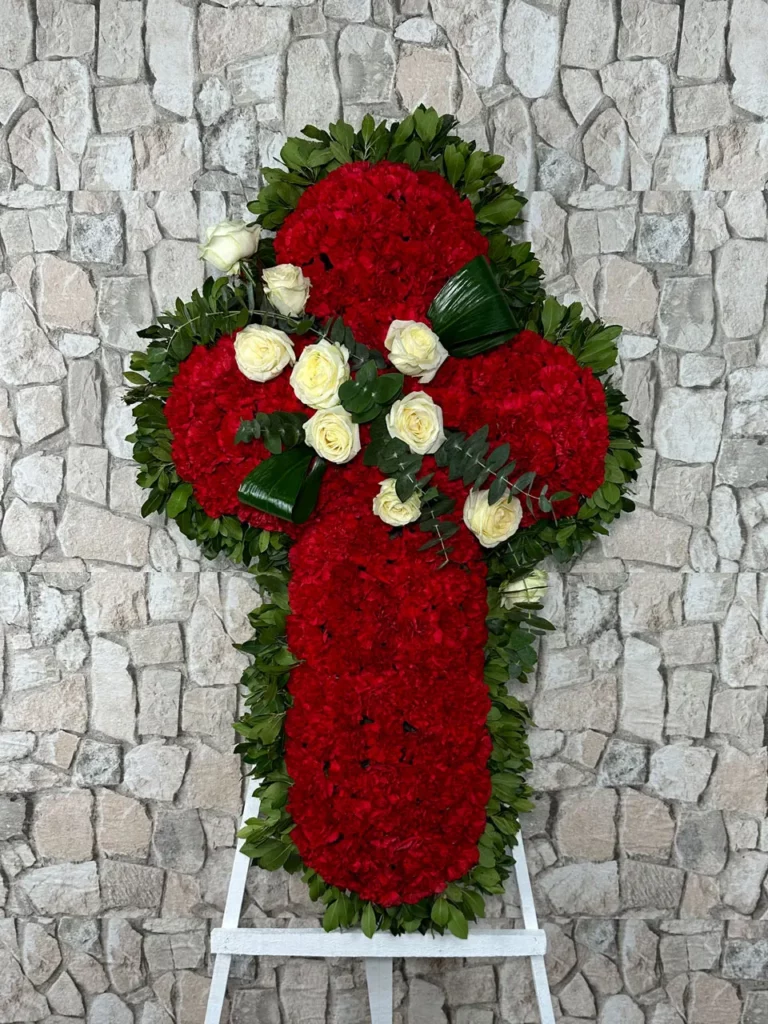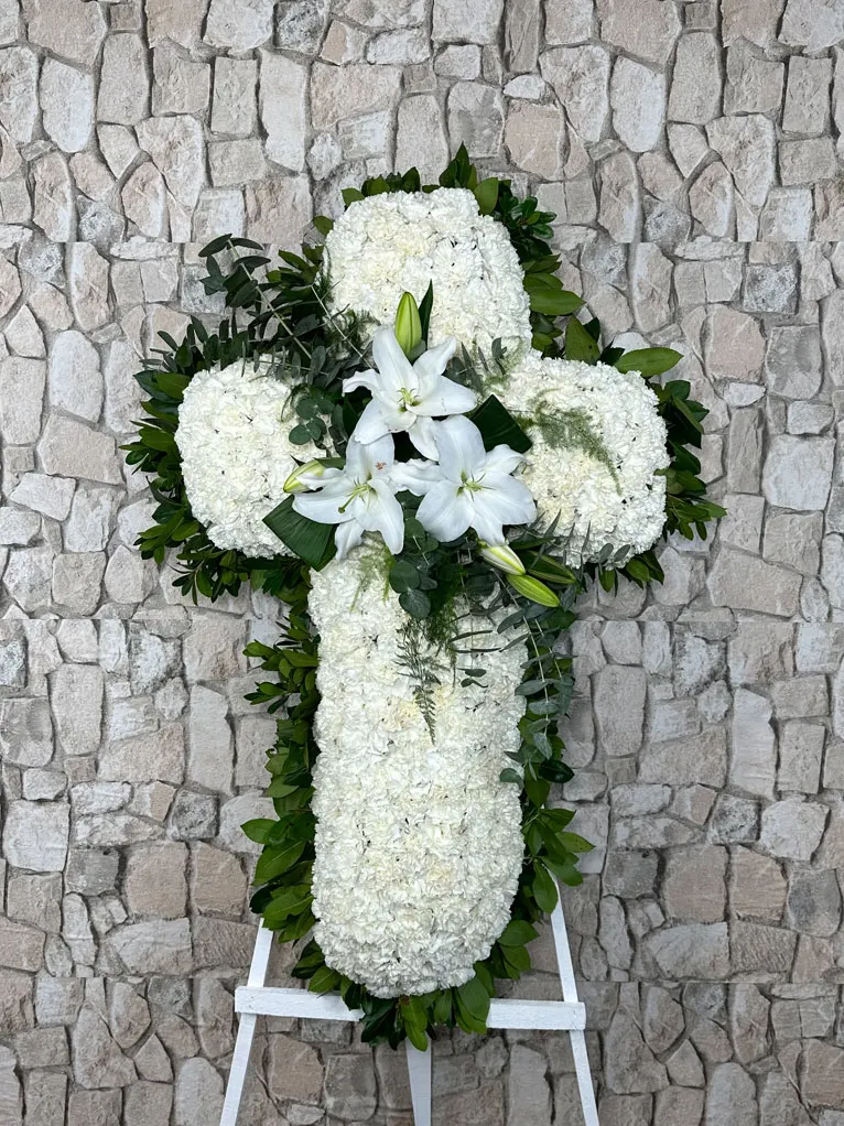 Exclusiva Cruz de flores La Angostura, una composición muy cuidada y confeccionada al detalle. Confeccionada con rosas amarillas y lilium blanco, la elegancia y belleza se unen en esta Cruz para funeral de rosas amarillas perfecta para decir nuestro último adiós.